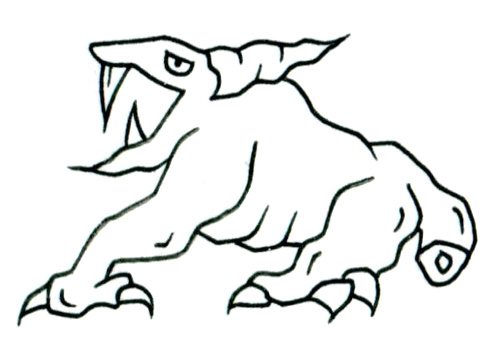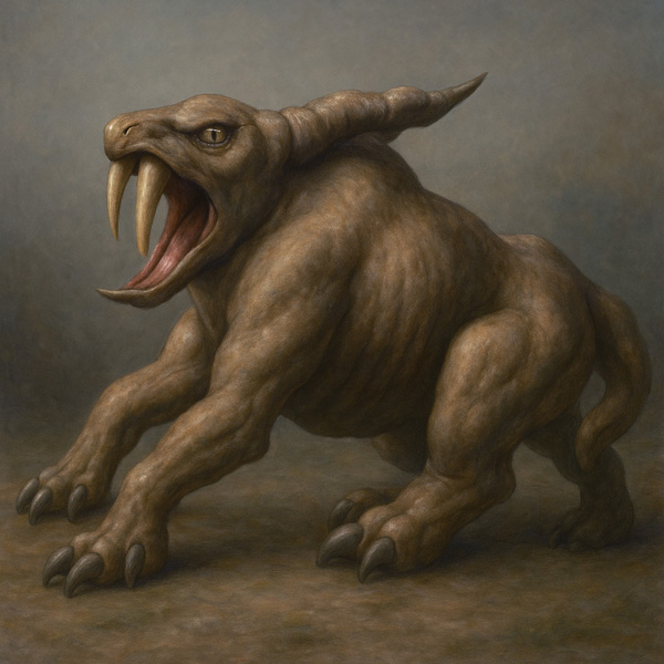 この作品に登場する存在は、まるで筋肉の塊そのものが生命を得たかのような姿をしている。巨大な牙と一本の眼を持ち、前方に踏み出すその四肢には、異様に肥大化した筋と爪が浮かび上がっている。生物でありながらも、あまりにも彫刻的であり、意志の力で形成された構造体のようにも見える。
