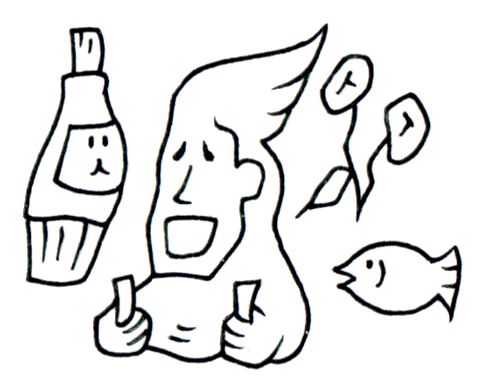 中央に描かれた人物は、手に何かを持ちながら大きく口を開けて笑っている。その姿は力強く、無防備で、どこか祝福された瞬間のようでもある。彼の左右には、人格を持ったかのようなボトルと葉が浮遊し、右下には小さな魚がこちらを見上げている。