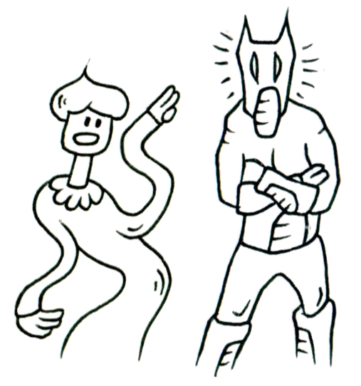本作は、異なる造形性をもつ二体の存在が、静かに並び立つ構図で描かれている。左の存在は、波打つ身体と柔らかな表情が印象的な有機的フォルムをもち、軽やかさと親しみやすさを体現している。一方、右の存在は動物的な仮面と無表情さを湛えた構えから、沈黙と抑制、そして内に秘めた力強さを感じさせる。