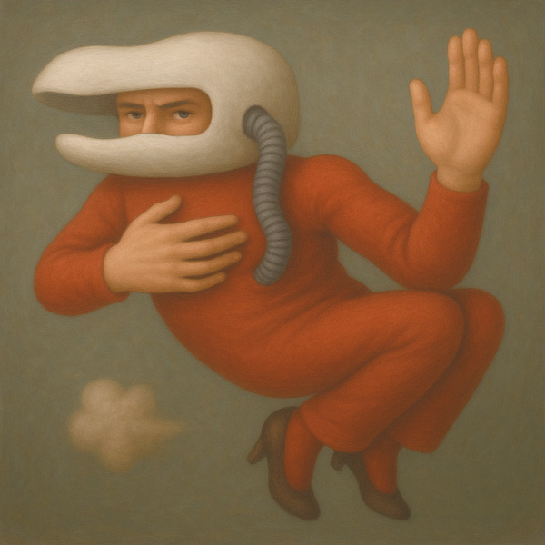 本作は、白いヘルメットと赤い全身スーツに身を包んだ人物が、宙に浮いた姿勢で静止している異形の肖像である。ヘルメットから胴体へと繋がる蛇腹状のチューブは、まるで生命維持装置の一部か、あるいは外部と接続された感覚器官のようでもあり、観る者にこの存在の在り方を問いかける。