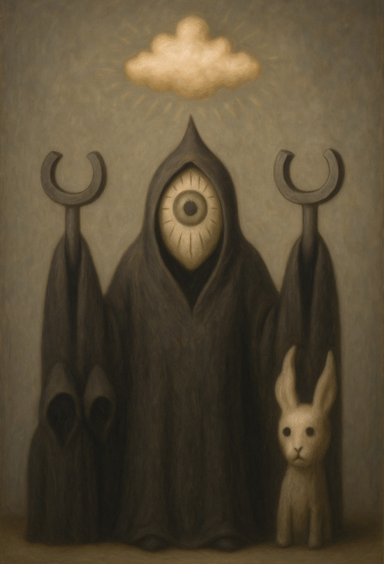 画面中央に立つのは、ローブをまとい一本の大きな目を持つ異形の存在。左右には蹄鉄のような儀礼的器具を掲げ、その足元にはフードを被った小さな従者と、無垢な表情を浮かべた白い兎が控えている。