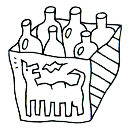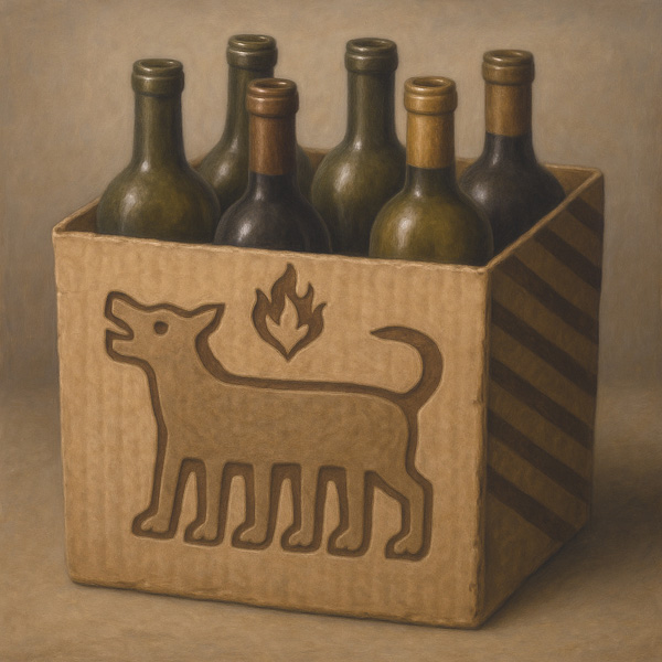 6本のガラス瓶が収められた箱の正面には、まるで古代の碑文のような線画の犬と、燃え上がる炎のシンボルが刻まれている。この描かれた図像は、単なる装飾ではなく、内容物を「守護する存在」のようにも見える。
