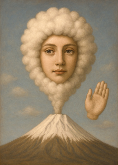 本作は、富士山の噴煙がそのまま人物の顔となり、空中に漂うように現れるという構造をもつ幻想的な肖像画である。煙雲の輪郭が柔らかく膨らみ、その内側に静かで人間らしい眼差しが宿る。これは自然と人格の融合であり、霊峰富士が「顔」を持つことで、土地そのものが意思を帯びた存在として提示される。
