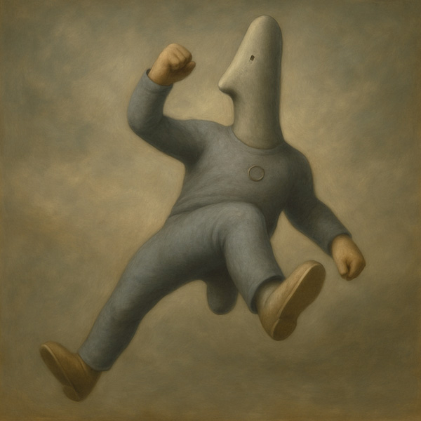 宙に浮いた人物は、まるで重力の方向を忘れたかのように不自然な姿勢で空中を舞っている。その顔はなく、かわりに長く歪んだ器具のような頭部が伸びている。これは匿名性の象徴であり、現代人が抱える「主体の不在」を暗示している。
