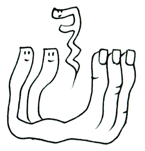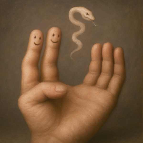 本作は、一見して手のひらを描いたように見えるが、その中に滑らかな違和感が潜んでいる。2本の指には表情が宿り、まるで何かを語り合っているようだ。そしてその会話に呼応するかのように、空中には蛇のような抽象的存在が浮遊している。