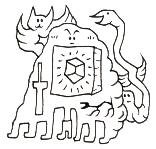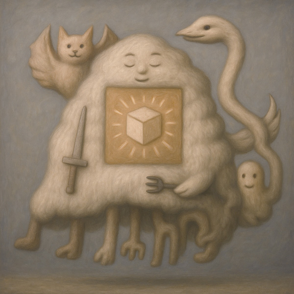 この作品には、明確な中心性と調和の象徴が込められている。中央に配置された光るキューブは、知識・創造・宇宙秩序の象徴として機能し、それを抱くように漂う存在は、雲のような外観を持ちながらも無数の足と手、動物や器具の意匠を一体に宿している。