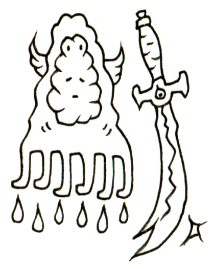 雲のような質感をもつ多脚の存在は、静かに液体を滴らせながら、隣に浮かぶ神秘的な剣とともに配置されている。柔らかく曖昧な輪郭をもつこの生物は、悲しみや内省を象徴しており、そのしずくは内面からあふれる感情の具現とも捉えられる。