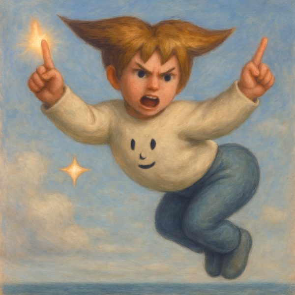 鋭い眼差しで空を駆けるこの人物は、掲げた指先に光を宿し、何かを指し示すように進む。突き出した臀部と宙に浮いた姿勢は、重力から解き放たれた自由さと、力強い意志の両方を感じさせる。
