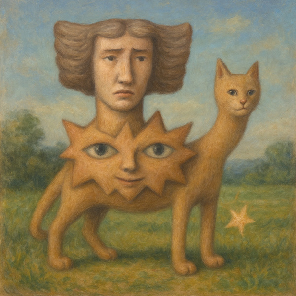 猫の身体に三つの顔を宿すこの存在は、人間、猫、そして星型の面貌を同時に携えている。人間の顔は憂いを帯び、星の顔は曖昧な笑みを浮かべ、猫の顔は静かに遠くを見つめる。どの表情も主ではなく、従でもない。