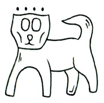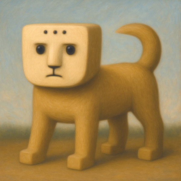 四角く整えられた顔に、3つの点が整然と並ぶ。感情の読めない黒い瞳と、口角の下がった口元。全体は犬のような身体を持ちながら、顔だけは抽象的で彫刻的。
