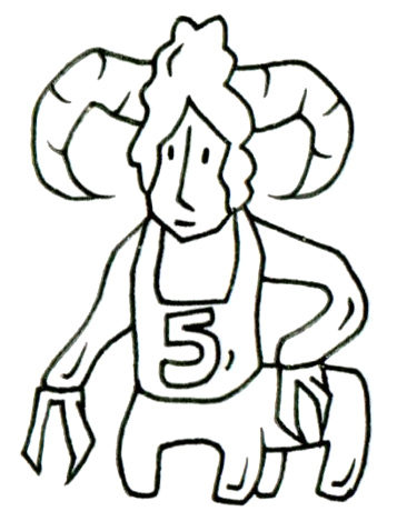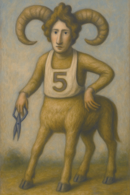 鋏を手に立つこの存在は、人でも獣でもなく、そのどちらでもある。ねじれた角を備えた顔は無表情でありながら、胸元に大きく記された「5」の数字が、何かしらの順番や意味を秘めていることを示唆する。
