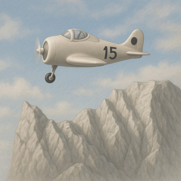 山肌をなぞるように飛ぶ一機のプロペラ機。その胴体に記された「15」という番号は、無数に存在する記録の中から選び取られた匿名の符号である。特別ではない、しかし確かにここを通過した機体。その下には、ひび割れたような岩山が連なり、過去の断層や記憶の層を思わせる。本作は、空と地のあいだで、名もなき存在が風景の一部となる瞬間を静かに刻み込む。
