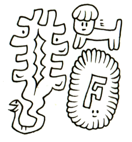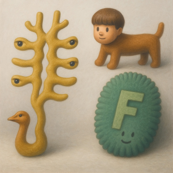 この画面に登場する三つの存在は、それぞれ異なる出自と論理をもつかのように、共に並びながらも交わらない。多眼を持つ植物状の生き物は、あらゆる方向へとまなざしを投げかけ、認識の網を張る。人の顔を持つ獣は、名付けと分類のあわいに揺れながら沈黙し、楕円の「F」は、言語の記号が感情を持ちうるという逆説を体現している。本作は、異なる体系が共存しつつも繋がらない世界における、視線・名・記号の距離についての静かな観察である。