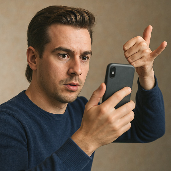 背景は無機質な空間でありながら暖かみがあり、現代における個人とデバイス、そして「伝えないまま伝わる」軽やかな承認の構図を巧みに抽出している。表情は驚きとも真剣とも取れるが、そこには強い感情ではなく、常に流れ続ける情報の中で判断と反応を反射的に繰り返す現代人の姿が映し出されている。