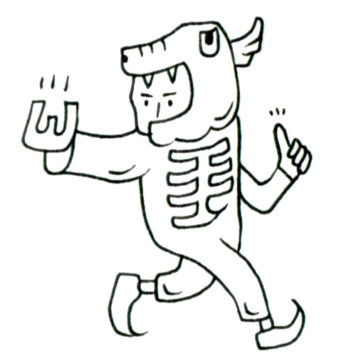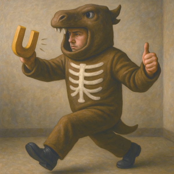 この作品は、ユーモラスな着ぐるみと写実的な空間描写が交錯する、奇妙にリアルな幻想絵画である。馬とも恐竜ともつかぬ頭部を持つ着ぐるみを着た男が、骨の模様を胸に掲げ、ひとつの部屋の中を大股で踏み出す。手には黄金の「U字型の物体」を握り、もう片方では力強く親指を立てる。このジェスチャーは、勝利のサインか、誰かへの応援か、それとも自分自身への肯定か。