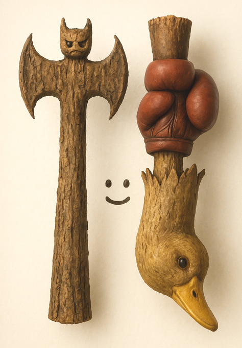 右は逆さにされたアヒルの頭が木の棒に刺さり、さらにそれをボクシンググローブが握るという、複層的な暴力の象徴系が成立している。