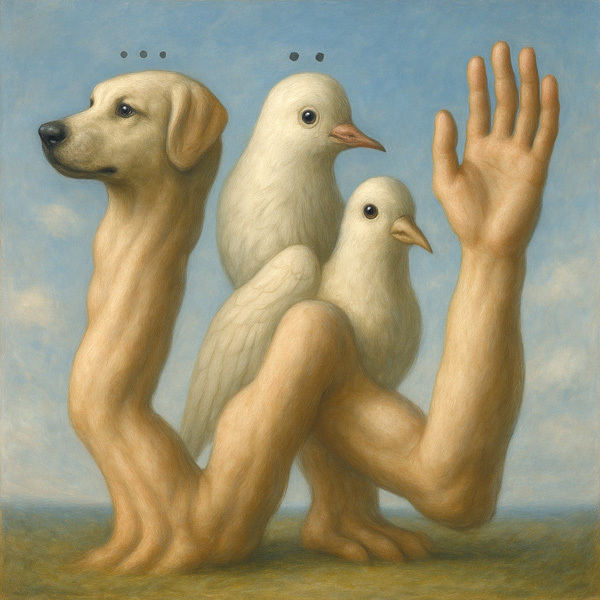 本作に描かれているのは、犬の頭部、二羽の白い鳥、そして高く掲げられた人間の手。