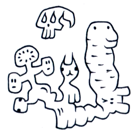 土のような質感をもった塊の上に、顔を持つ枝のようなもの、角を持つ猫のような生きもの、蠢く巨大な体をしたもの、そして空中には涙を流すようなドクロが浮遊している。