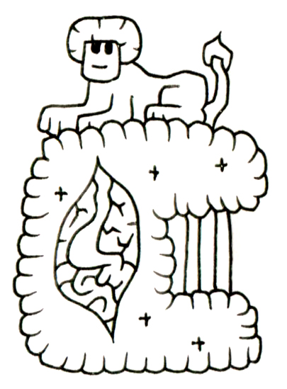 その下に広がる巨大な雲状構造は、外見こそ柔らかだが、内部には臓器のような脳と顔のような輪郭が浮かび上がり、まるでこの存在の「内面」や「記憶」が可視化されているかのようだ。右側の柱状構造は神殿建築を想起させ、空間全体が聖域のような雰囲気を纏っている。