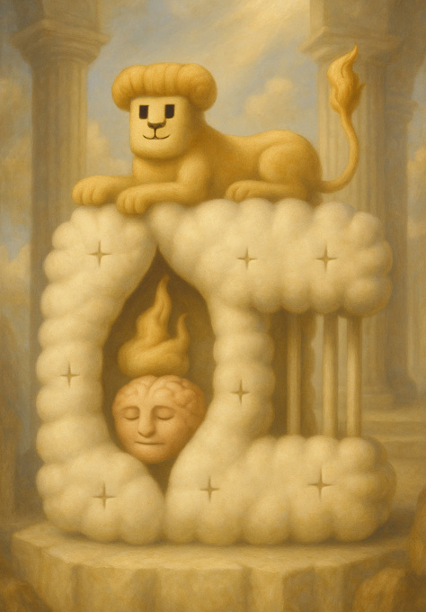 この作品は、荘厳な浮遊構造の上に鎮座するライオン風の存在と、その内部に隠された神秘的な裂け目を描いた象徴的な写実画である。上部の獣は、堂々とした姿で周囲を見渡し、尾の先が裂けているその形は、単なる動物ではなく「知覚をもつ門番」のような存在であることを示している。
