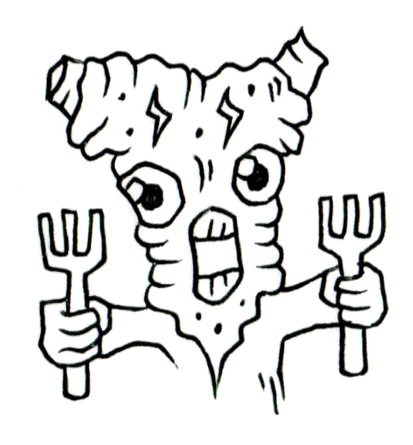 その両手には錆びたフォークが握られ、まるで儀式の道具か、忘れられた警告の標のように掲げられている。
