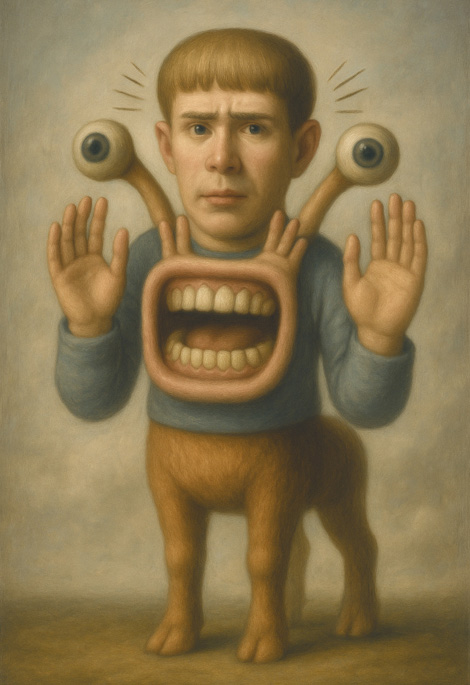 人の顔から裂けるように飛び出した大きな口、左右に外れた眼球、そして四足の胴体。