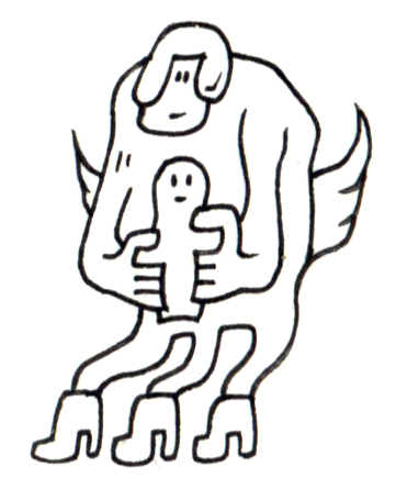 大地に腰を下ろす異形の存在が、小さな命を静かに抱えている。