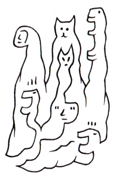 下部の倒れた胴体のような存在は、表情も持たず、ただ漂うかのように浮かぶ。