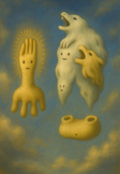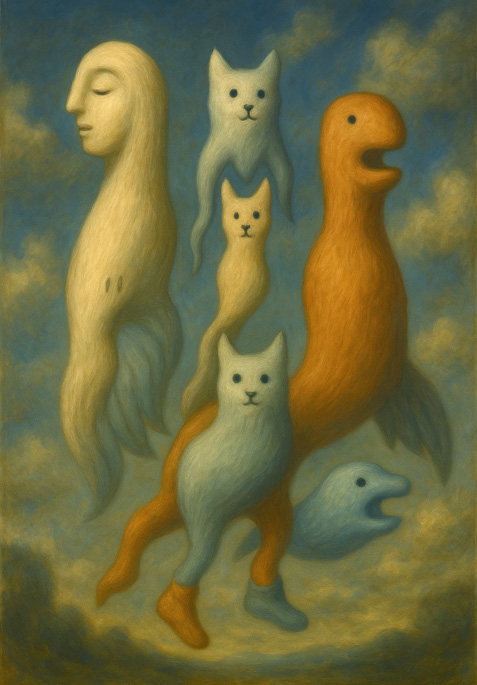 この絵に描かれたのは「形になる以前の意味」──名前も記号も与えられていないが、そこに確かに在るものたち。