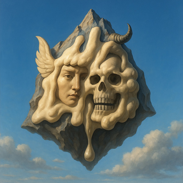 空に浮かぶ山塊の一部が溶解し、二つの顔をあらわにしている。左には静謐な人の顔が、右には空洞の骸骨が浮かび、その境界は滑らかな融解の流れによって曖昧に溶け合っている。翼や角といった異質なパーツは、それぞれの顔が象徴する異なる次元——生と死、希望と暴力、記憶と忘却——の暗示として添えられている。