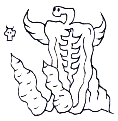 上部から伸びる蛇状の首は、あらゆる知覚が融合した器官のように空を見つめ、左上には浮遊する角付きのドクロが静かに佇む。