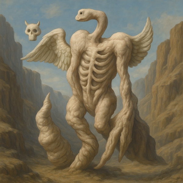 二本の螺旋脚を持つ異形の存在が、広大な渓谷を背景に立っている。肉のように柔らかくも骨のように硬質な胴体は、まるで風化しかけた神話的遺物のように見え、その背には実在の鳥の羽毛と見まがうほどの翼が広がっている。