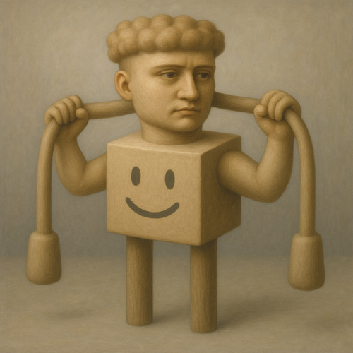 直立するこの存在は、立方体の胴体に笑顔を浮かべたアイコンを抱え、太くたくましい腕で左右のコード状の物体を引き上げている。その表情はどこか厳しく、集中した面持ちをたたえているが、足元を見ると、その脚は現実の肉体ではなく、滑らかに削られた木の棒で構成されている。
