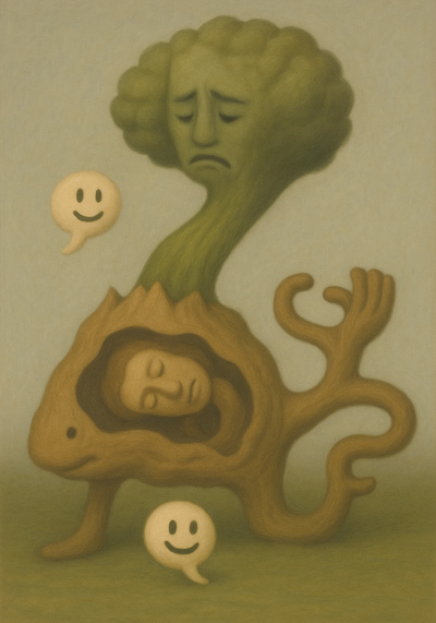 本作は、言語と沈黙、記憶と表現のあいだに横たわる「声なき声」を主題とした視覚的寓話である。眠る顔を抱いた木のような存在は、頭上に感情を湛えた雲のような表情を浮かべながら、周囲のにこやかな吹き出しと共に立っている。語られないこと、語ることができないこと、あるいは語りすぎて空転する言葉たちの姿が、抽象的なフォルムと共に戯画的に描かれている。