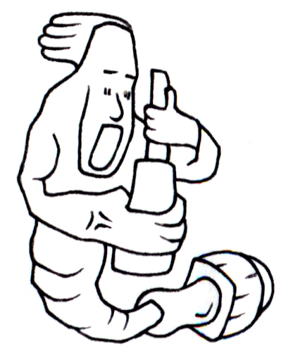 柔らかな管のような身体に、ぽっかりと開いた口。腕は一本の瓶をしっかりと抱え、その仕草には歓喜でも恐怖でもない、曖昧な情動が漂っている。足元はもはや足ではなく、何かの口吻のように変容し、全体が静かにうねっている。