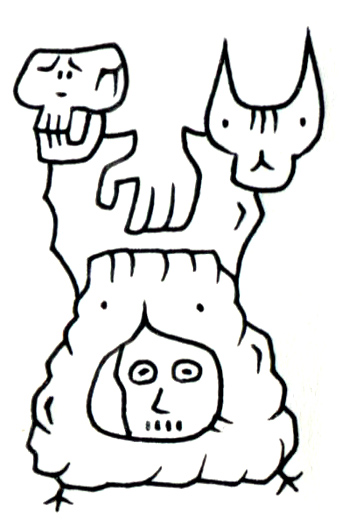 その下で、塊状の身体の中心に埋もれるようにして、仮面のような人間の顔が静かにこちらを見つめている。
