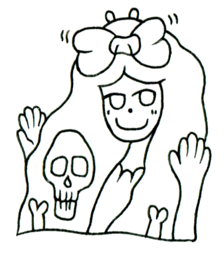 本作における少女の姿は、一見すると明るく無垢な表情を湛えているが、その長く流れる髪の内に潜む頭蓋骨が、死や喪失といった抑圧された主題を密やかに忍ばせている。