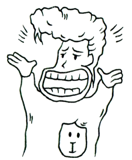 大仰な身振りと誇張された笑顔は、自己防衛的なパフォーマンスとしての理解不能を演じており、その胸に配置された無表情の顔、そして足元の沈んだ表情は、その演技の背後にある内的な困惑や不在感を示唆している。