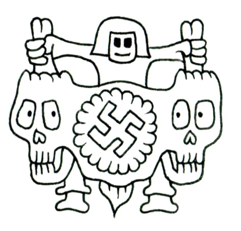 この作品は、ひとつの身体で両側の骸骨を掲げる人物を中心に構成されており、その幕の中央には鉤十字が刻まれている。古代的かつ制度的な形を持つこの記号は、ここでは歴史的文脈から切り離され、象徴そのものとして扱われている。人物の表情は無垢でありながら、その手にあるものの意味は極端に重く、意識の断絶が強調されている。左右対称の構図と、骨という不変の素材が与える永続性の印象は、「伝承」と「忘却」、「無知」と「再演」のあいだにある危うい均衡を浮かび上がらせる。意図された儀式性と不穏な均質性のなかで、この幕は問いかける——何が掲げられ、誰のために、どこへ向けてか。