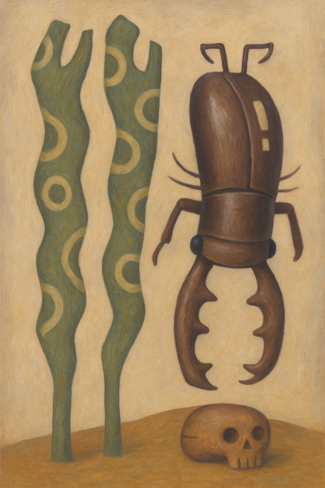 二本の波打つ有機体と一体の甲虫的な存在が、画面のなかで奇妙な均衡を成している。左側の存在は植物でも動物でもない、円環の紋様をもつ柔らかな生体のようであり、自己を模した記号の連続体のようにも見える。一方で右の存在は堅い殻をまとい、逆さにぶら下がるような姿勢で沈黙している。