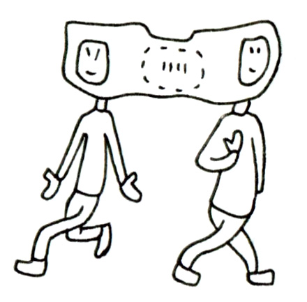 体は別々でありながらも、完全な個とは言えず、彼らの歩みは互いに干渉し合っている。左の人物は足早に歩みを進め、右の人物は手を胸に当てながら、より慎重な歩調をとっている。行動のズレが、ひとつの共有された頭部に緊張感と詩的な矛盾を与えている。