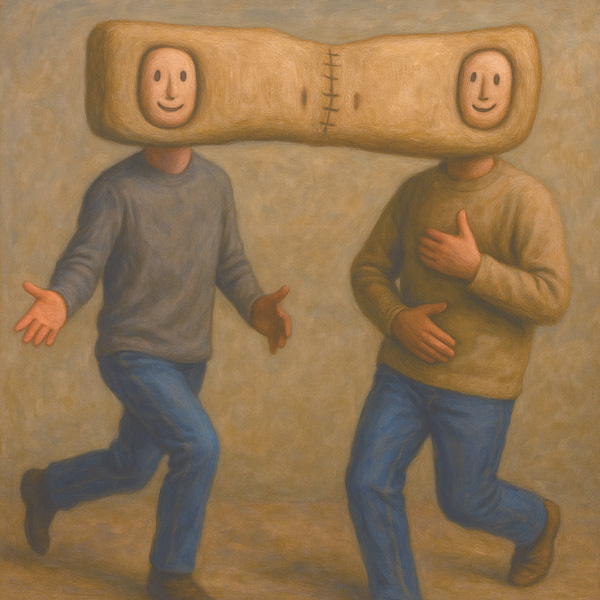 この作品には、一つの柔らかい頭部を共有する二人の人物が描かれている。顔は両端に分かれており、それぞれが異なる方向へ進もうとしているが、頭の中央には縫い目のような痕跡があり、かつて分離されていたものが繋ぎ合わされたようにも、逆に切り離されかけているようにも見える。