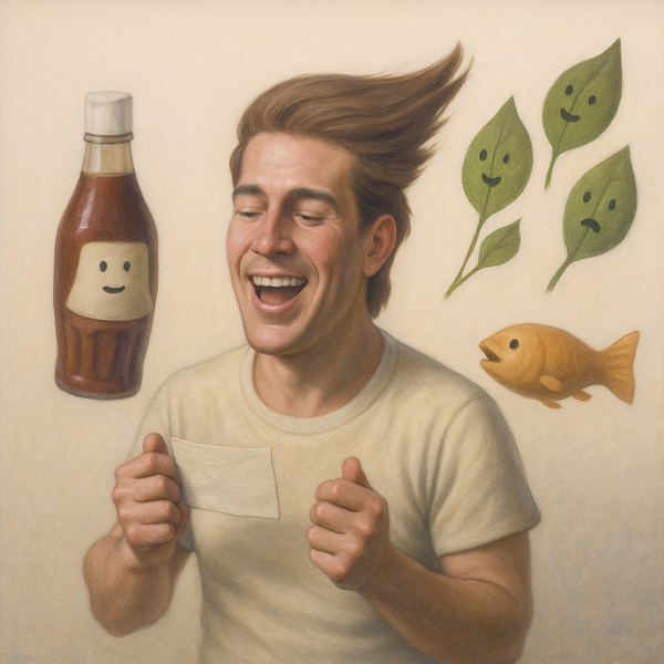 中央に描かれた人物は、手に何かを持ちながら大きく口を開けて笑っている。その姿は力強く、無防備で、どこか祝福された瞬間のようでもある。彼の左右には、人格を持ったかのようなボトルと葉が浮遊し、右下には小さな魚がこちらを見上げている。