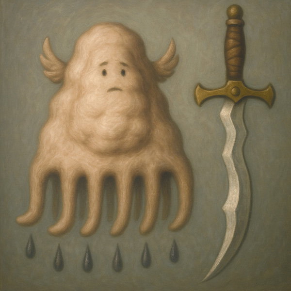雲のような質感をもつ多脚の存在は、静かに液体を滴らせながら、隣に浮かぶ神秘的な剣とともに配置されている。柔らかく曖昧な輪郭をもつこの生物は、悲しみや内省を象徴しており、そのしずくは内面からあふれる感情の具現とも捉えられる。