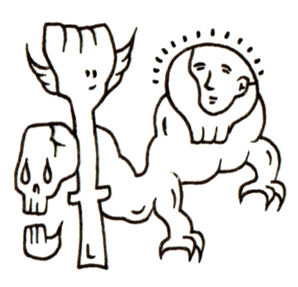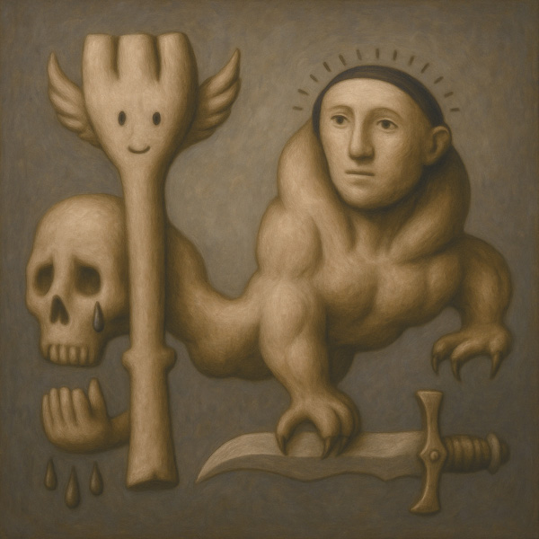 この作品には、複数の異なる象徴が一体化した存在が描かれている。涙を流す頭蓋、羽根をもつ柱状の顔、そしてライオンの身体に人間の顔を持つ神話的存在が連なり、静かに佇んでいる。それぞれの要素は、感情、精神、肉体の三位を象徴し、個々が独立しながらも融合する形で共存している。異質なものたちがひとつの生命体として統合されるこのイメージは、内なる矛盾や調和の可能性について観る者に深い問いを投げかける。