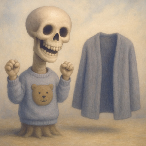 この作品は、骸骨のような頭部を持つユーモラスな存在が、明らかに場違いな服を着て登場する奇妙な瞬間を捉えた、静かな笑いと不穏さを同居させた絵画である。キャラクターは、胴体の先が木の切株のようになっており、その上に不釣り合いなまでに愛らしいクマの顔がプリントされたスウェットを着ている。その隣には、空っぽのカーディガンが宙に浮き、まるでこれから誰かが着るのを待っているかのようだ。