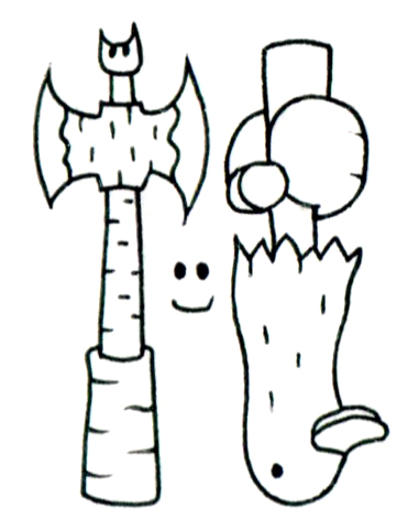 左は斧の形状を持ち、硬質な木の皮で形成されており、自然の中に潜む威圧的な力を象徴する。