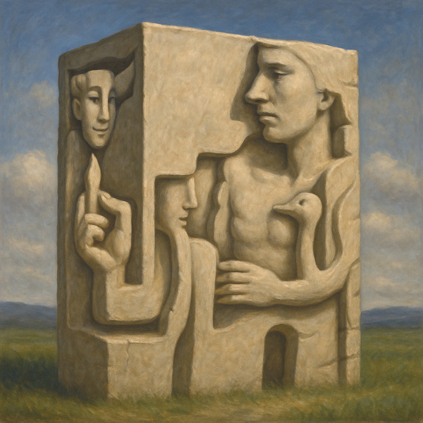 この彫像は、人間の意識の断片、断絶した関係性、または語られなかった物語の集合体として読み取ることができる。
