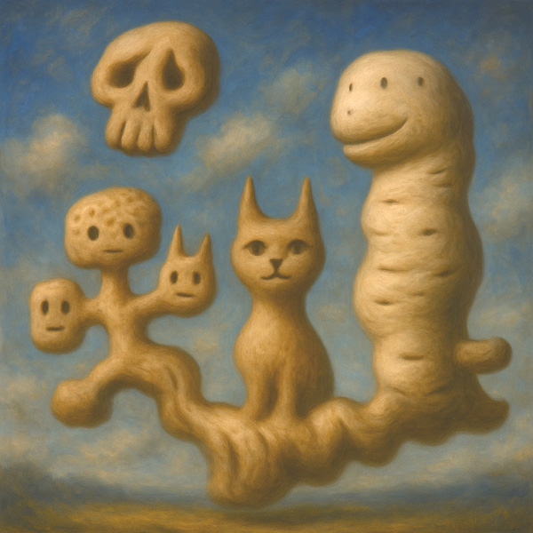土のような質感をもった塊の上に、顔を持つ枝のようなもの、角を持つ猫のような生きもの、蠢く巨大な体をしたもの、そして空中には涙を流すようなドクロが浮遊している。