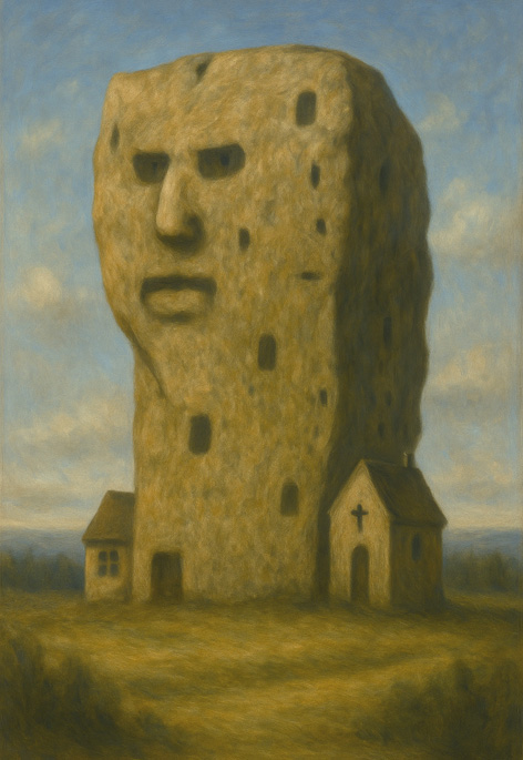 この作品は、時間によって彫られた無言の存在と、人間がそこに投影する意味とのあいだに横たわる距離を、風景の中に封じ込めている。